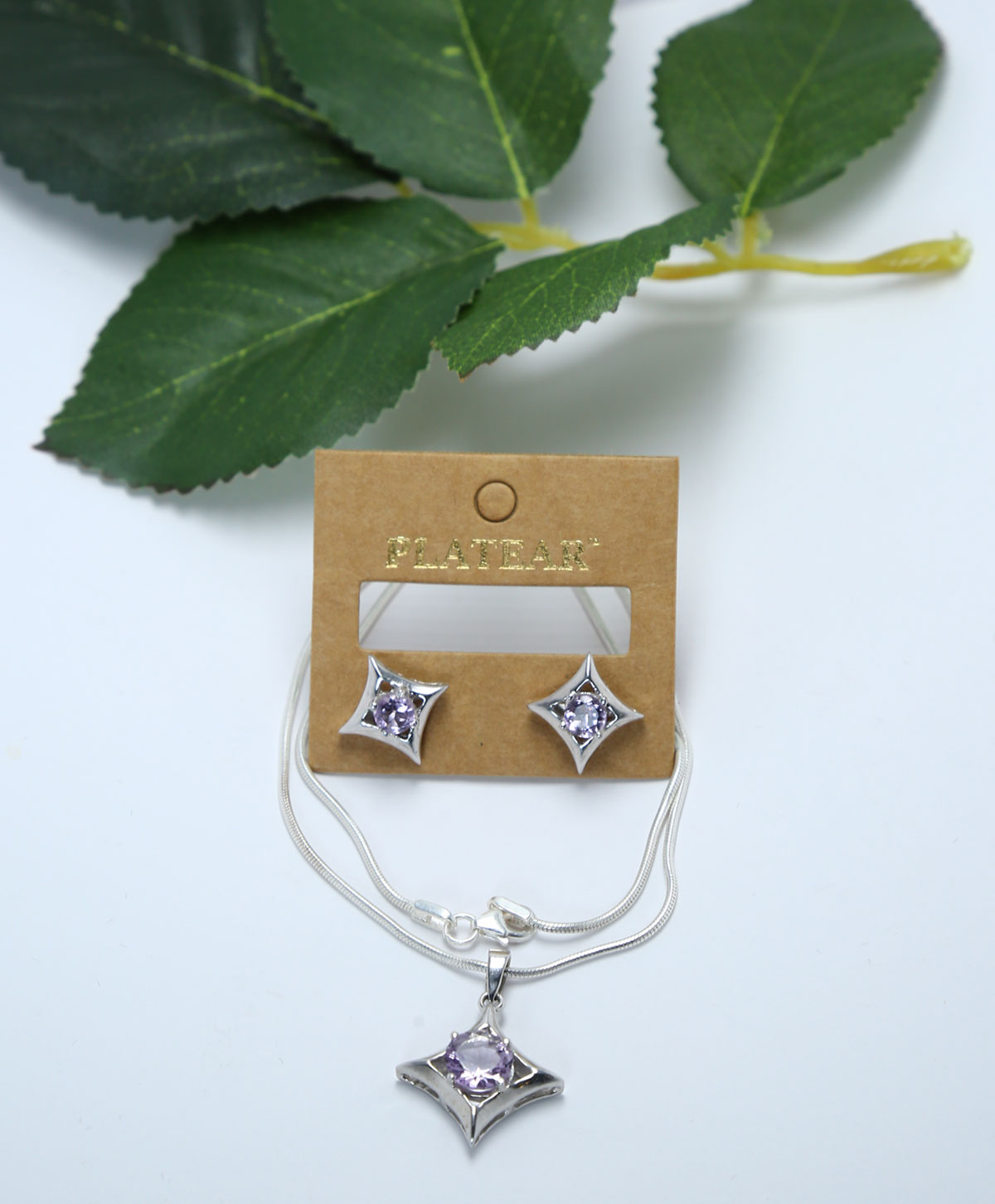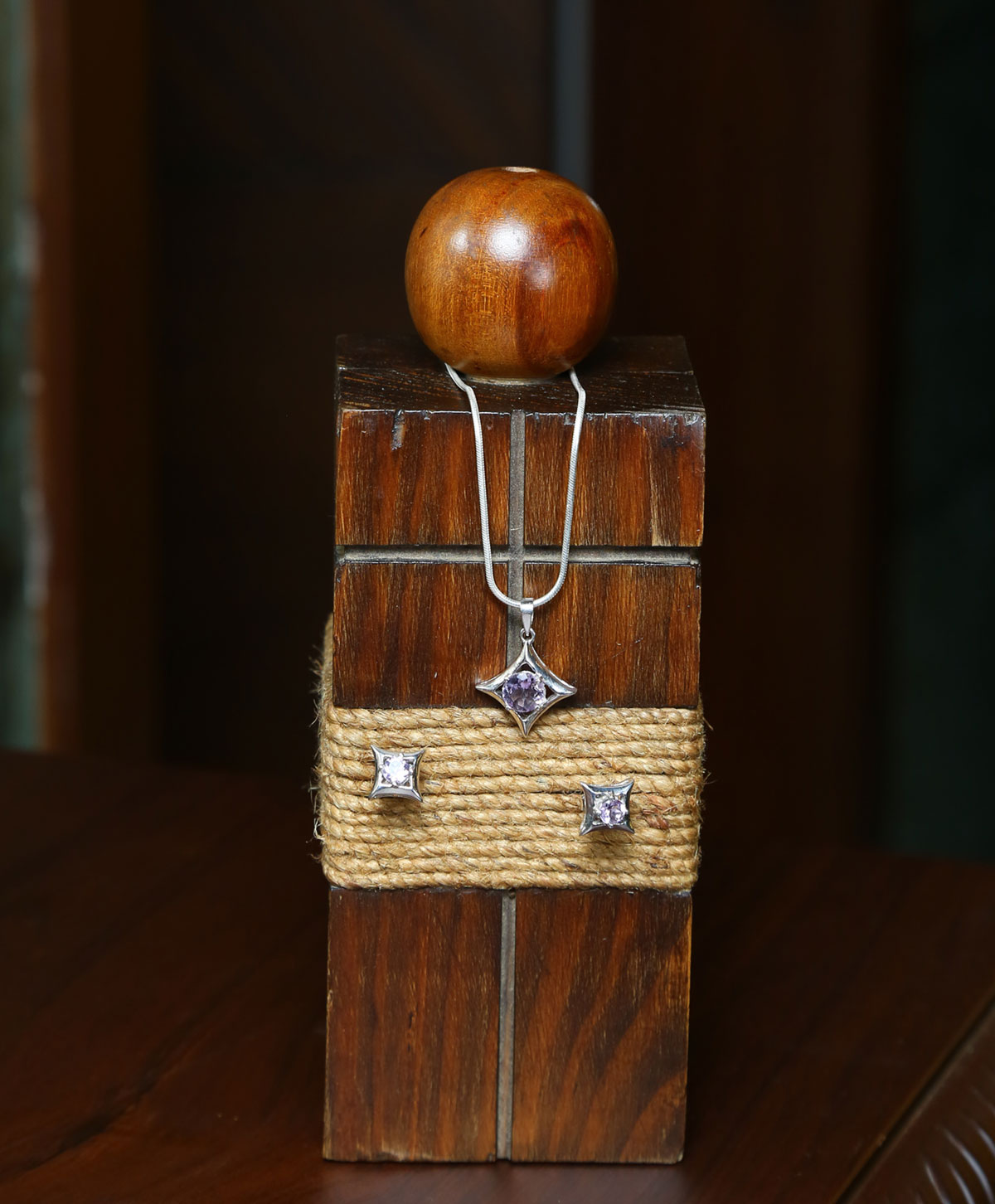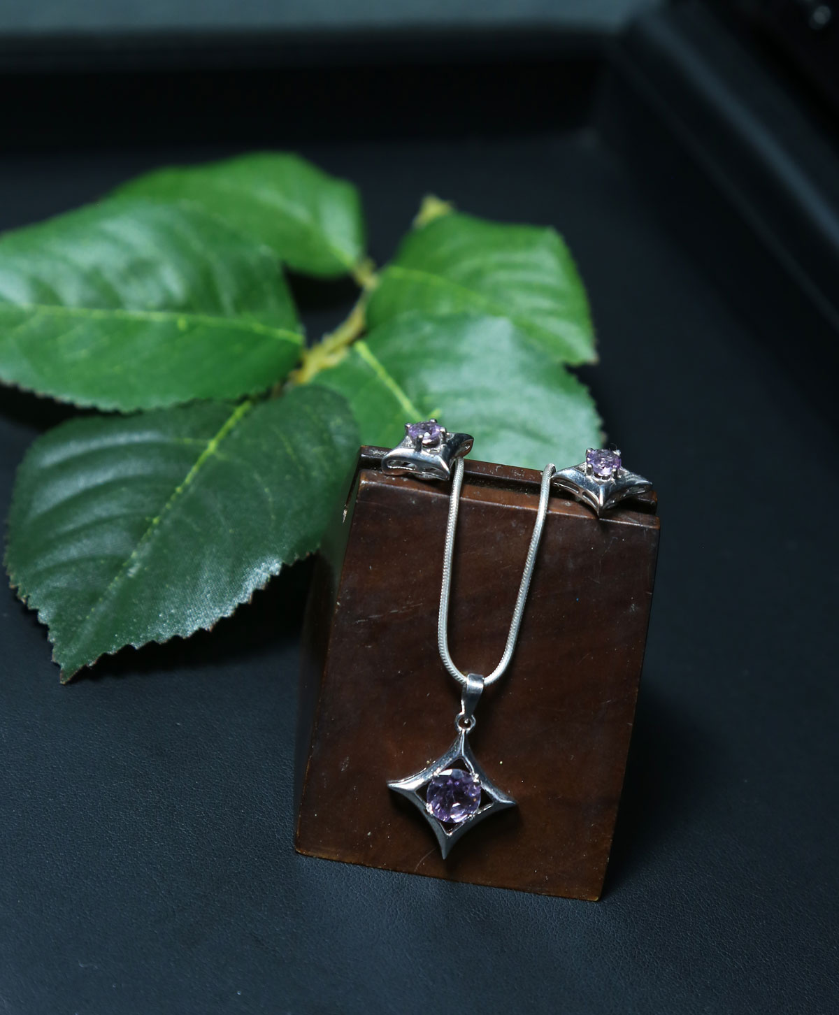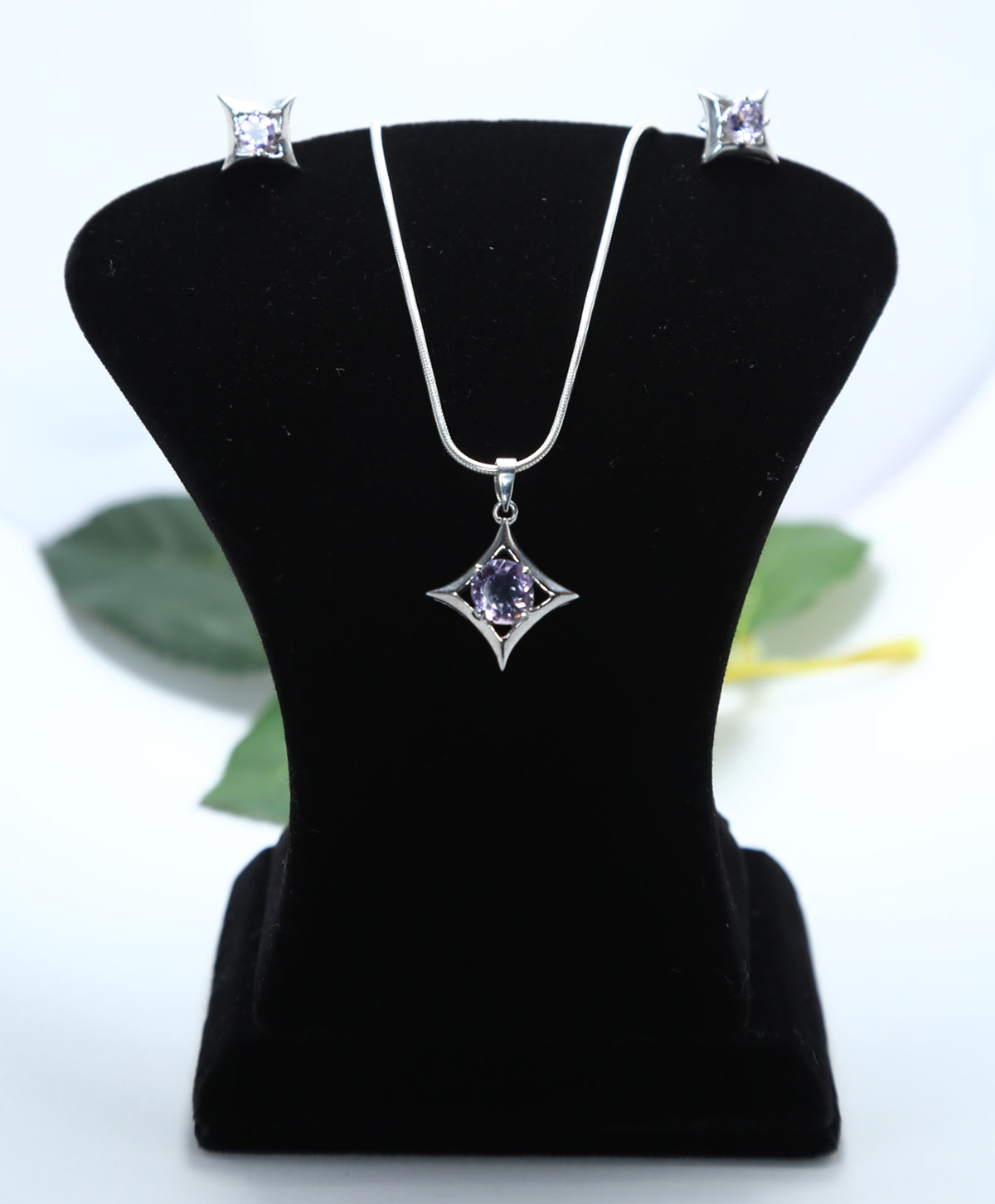 Description: –  This elegant jewelry set features a pendant and matching stud earrings, each adorned with a sparkling lavender-hued gemstone set in a unique star-shaped silver frame. The design is reminiscent of a twinkling star in the night sky, symbolizing guidance, brilliance, and inner light. The faceted gemstone catches the light beautifully, adding a subtle yet radiant glow to the piece.