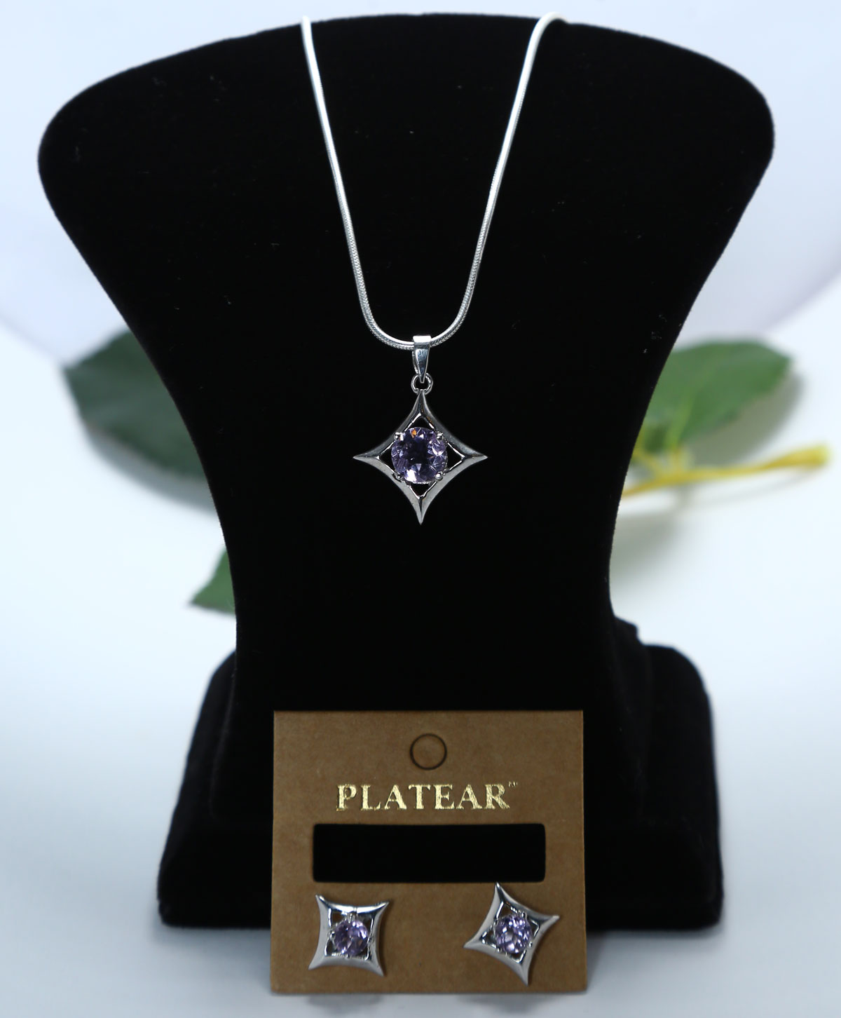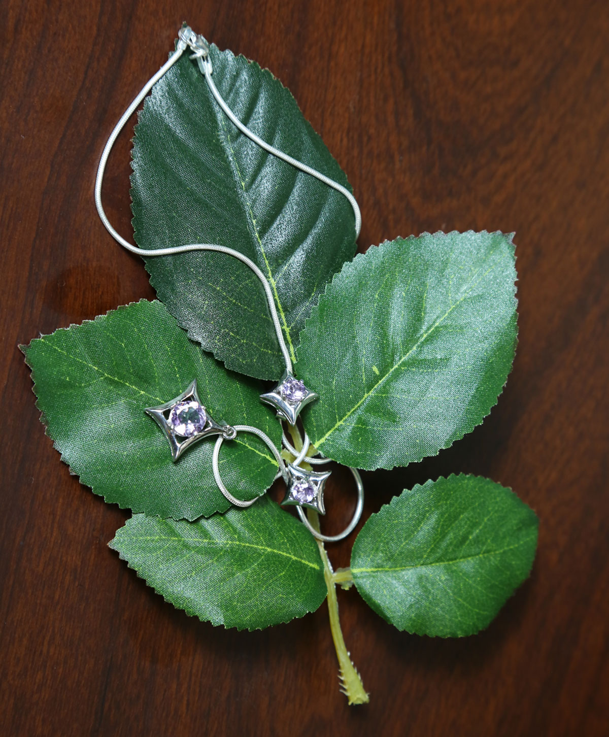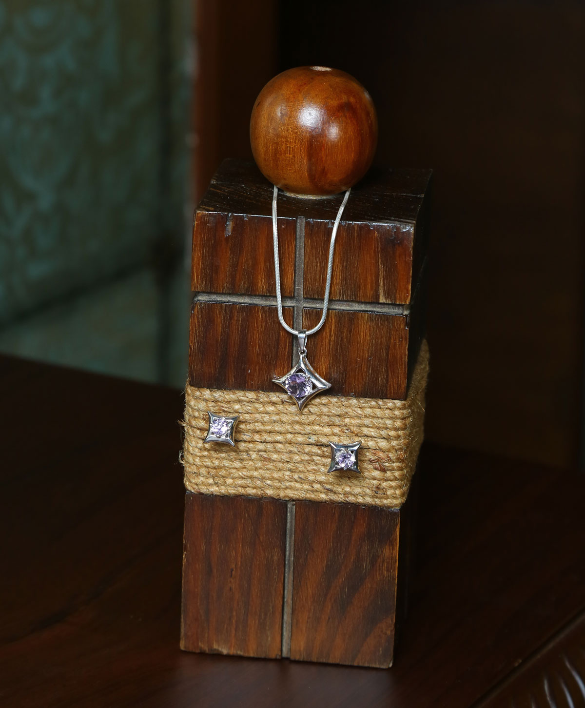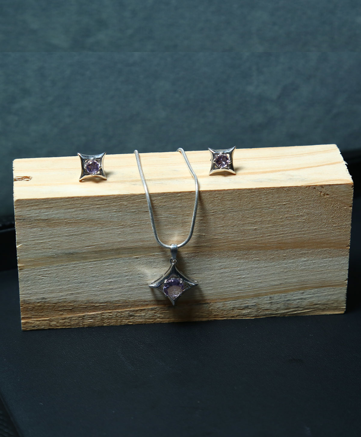 Description: –  This elegant jewelry set features a pendant and matching stud earrings, each adorned with a sparkling lavender-hued gemstone set in a unique star-shaped silver frame. The design is reminiscent of a twinkling star in the night sky, symbolizing guidance, brilliance, and inner light. The faceted gemstone catches the light beautifully, adding a subtle yet radiant glow to the piece.